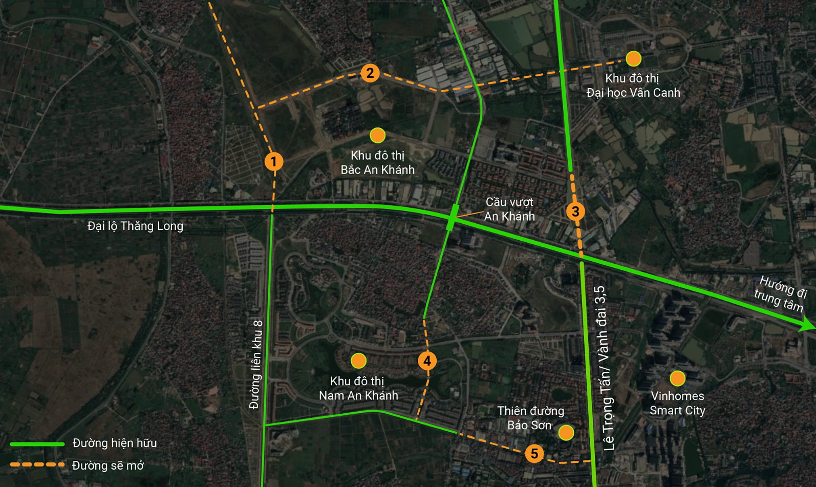 Trong đó, tuyến số 1 sẽ nối từ đường liên khu 8 của khu đô thị Nam An Khánh sang Bắc An Khánh hướng đi xã Song Phương, Lại Yên (huyện Hoài Đức), mặt cắt ngang khoảng 50m. Đoạn bên phía Nam An Khánh cơ bản hoàn thành, nhưng bên Bắc An Khánh chưa xây dựng.